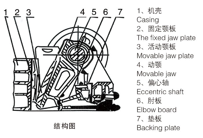 該系列破碎機工作方式為曲動擠壓型,其工作原理是:電動機驅(qū)動皮帶和皮帶輪,通過偏心軸使動顎上下運動,當(dāng)動顎上升時肘板與動顎間夾角變大,從而推動動顎板向固定顎板接近,與其同時物料被壓碎或劈碎,達到破碎的目的;當(dāng)動顎下行時,肘板與動顎夾角變小,動顎板在拉桿,彈簧的作用下,離開固定顎板,此時已破碎物料從破碎腔下口排出。隨著電動機連續(xù)轉(zhuǎn)動而破碎機動顎作周期運動壓碎和排泄物料,實現(xiàn)批量生產(chǎn)。